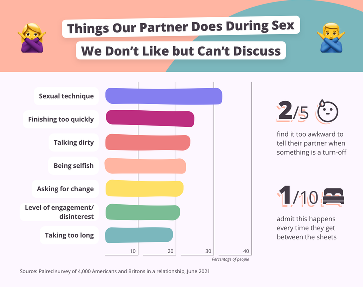 According to our survey, 2 in 5 of us find it too awkward to talk to our partner about sex, and just under half of us secretly hate something our partner does, but are too polite to tell them.